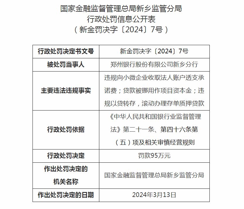 依据《中华人民共和国银行业监督管理法》第二十一条、第四十六条第(五)项及相关审慎经营规则,国家金融监督管理总局新乡监管分局对郑州银行新乡分罚款95万元。